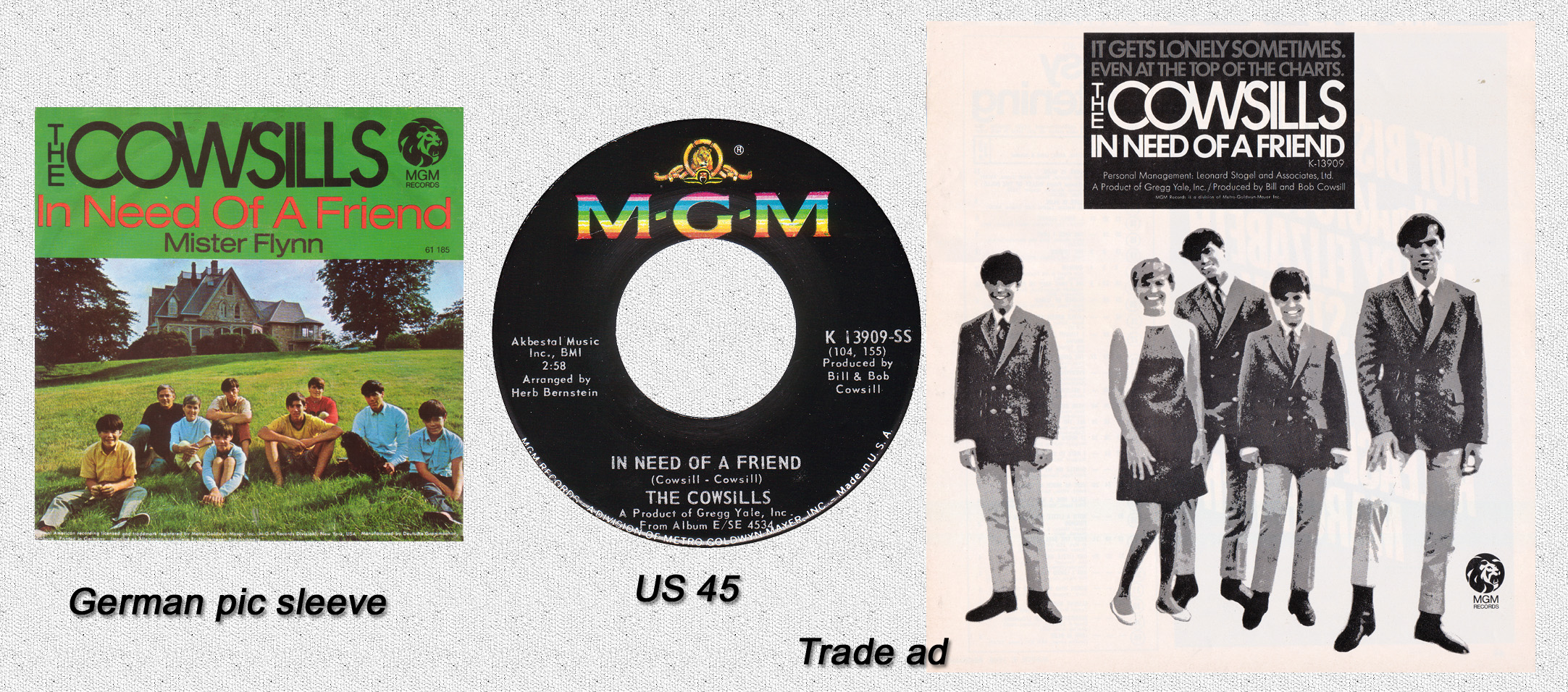 Another standout track on the LP was “Gray, Sunny Day” co-written by Bill and Bob with Tony Powers, one-time collaborator with Ellie Greenwich and, at the time, hot with “98.6” for Keith and “Lazy Day” for Spanky & Our Gang. It would have made a perfect 45. And it did! But in the UK, they were beat to the punch when Linda Kendrick released a version on the UK Philips label, backed, surprisingly enough, by The Cowsills’ “In Need Of A Friend.” The Cowsills got another cover from their second LP when trumpeter Al Hirt released a medley of “We Can Fly”/”Up Up And Away” on RCA in 1968.